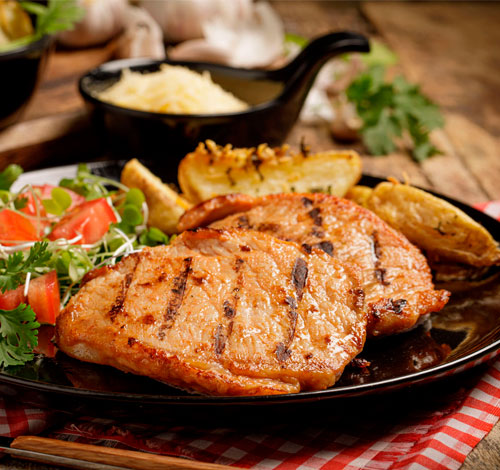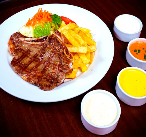 Res y chancho + Porción de arroz + Papas fritas + Ensaladas + Full cremas + Jarra de chicha